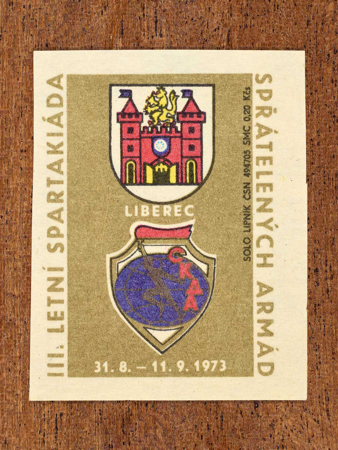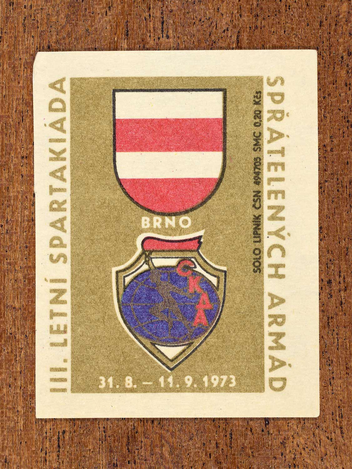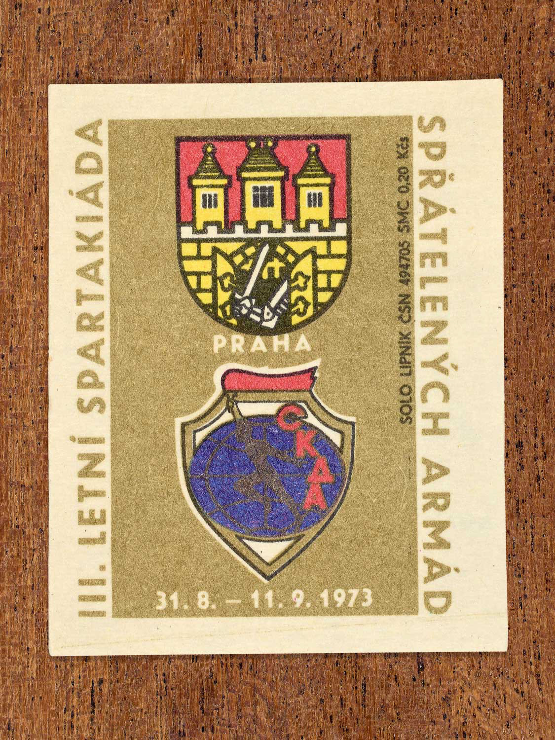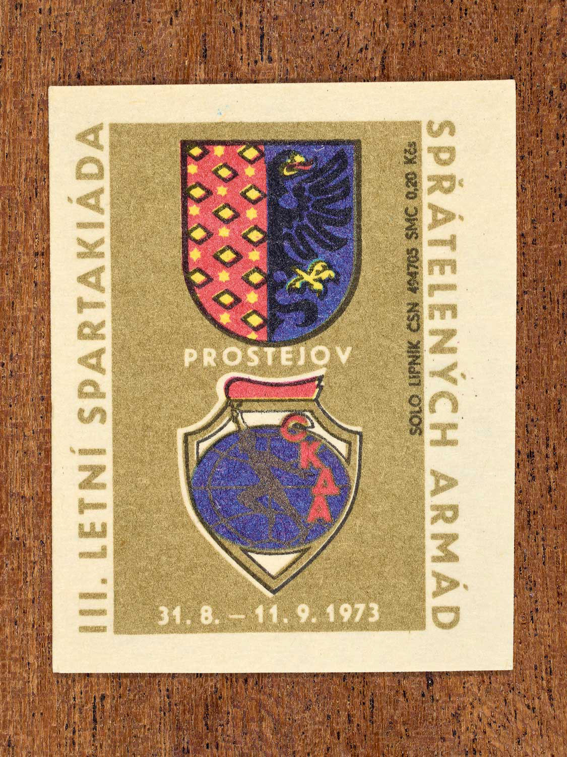 The following labels feature a Czechoslovak military-sports emblem paired with the official coat of arms of each host city.