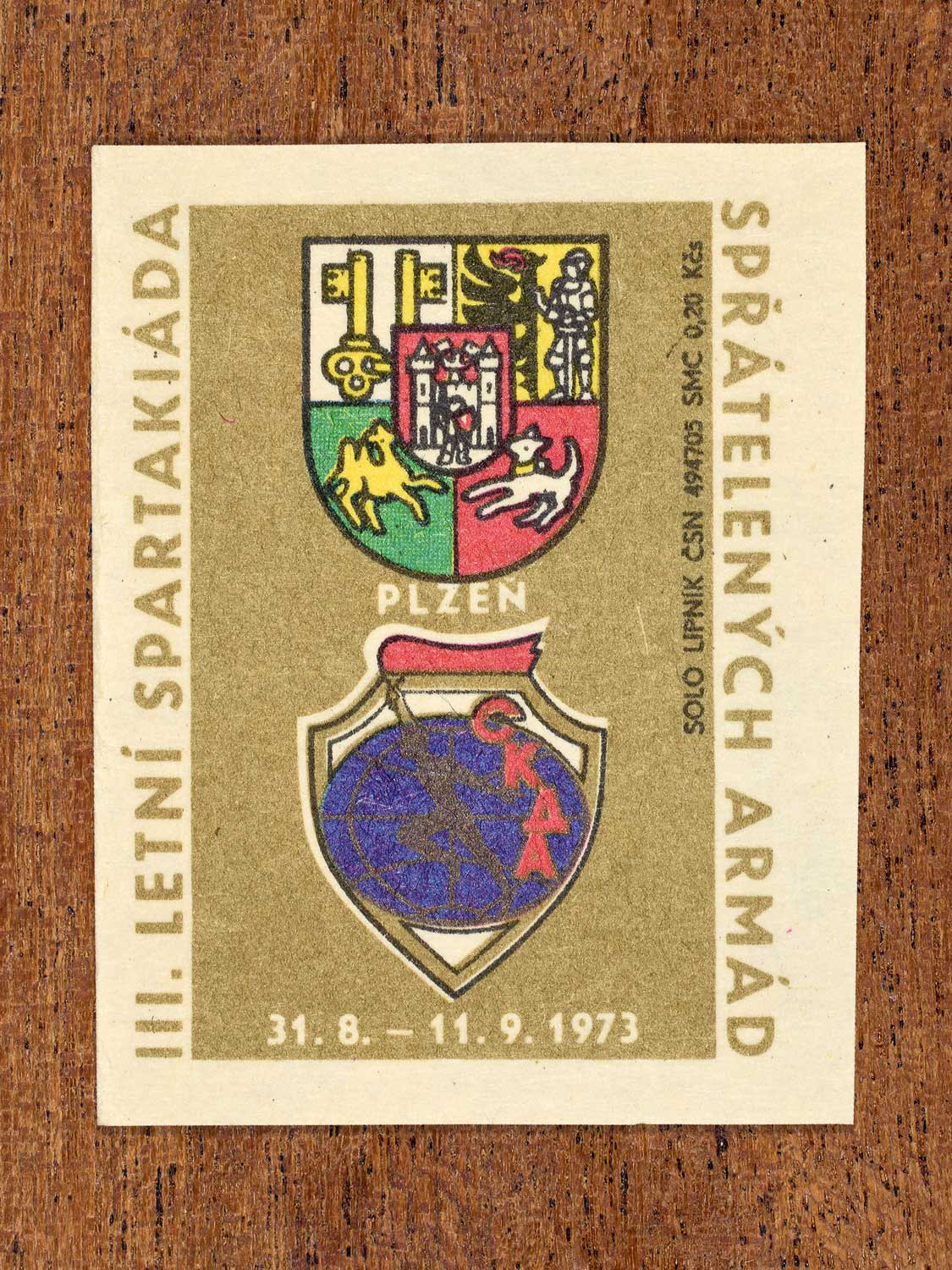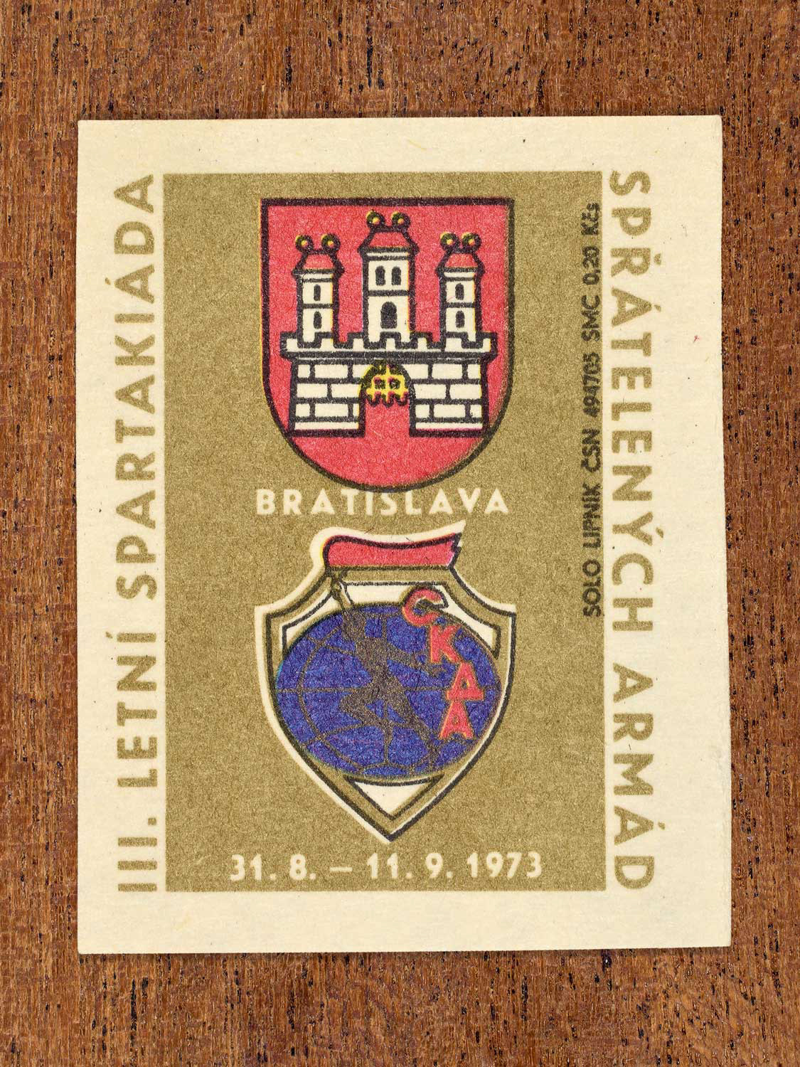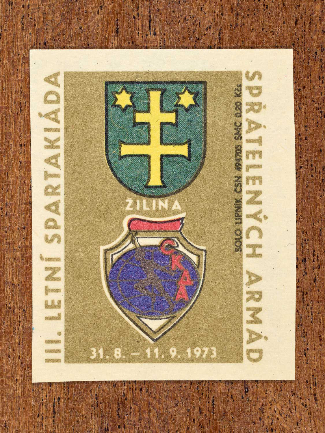 The following labels feature a Czechoslovak military-sports emblem paired with the official coat of arms of each host city.