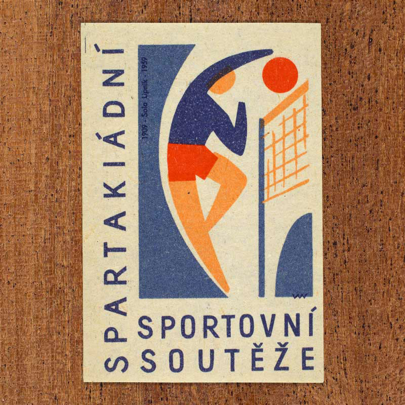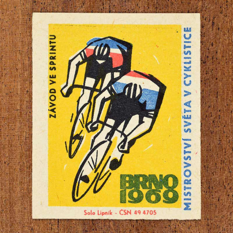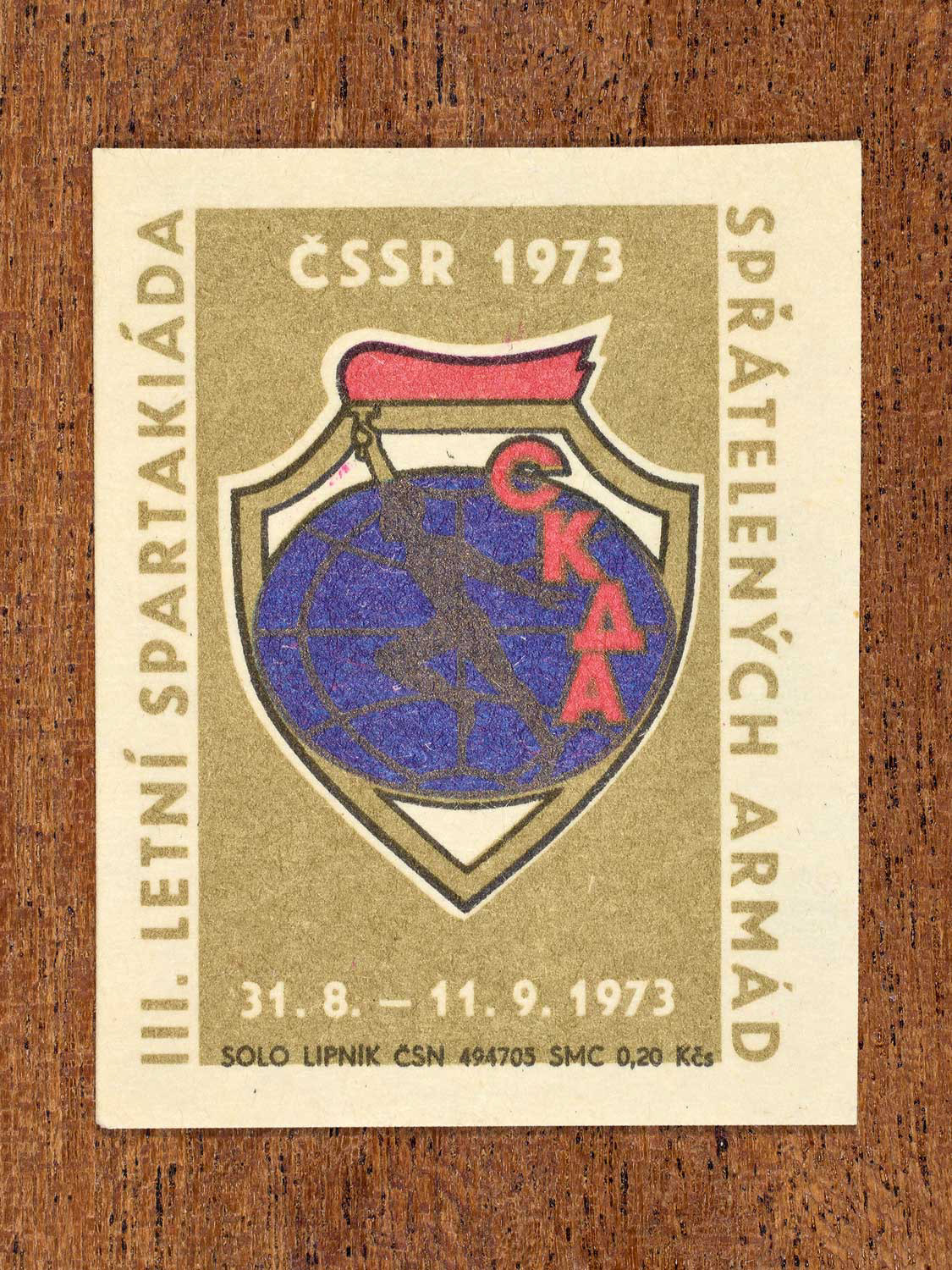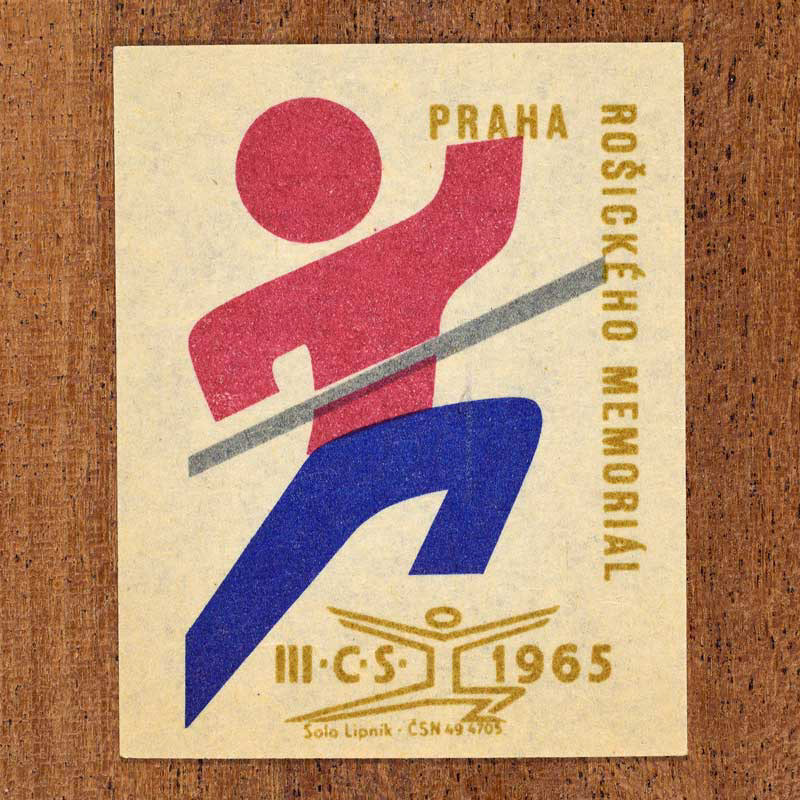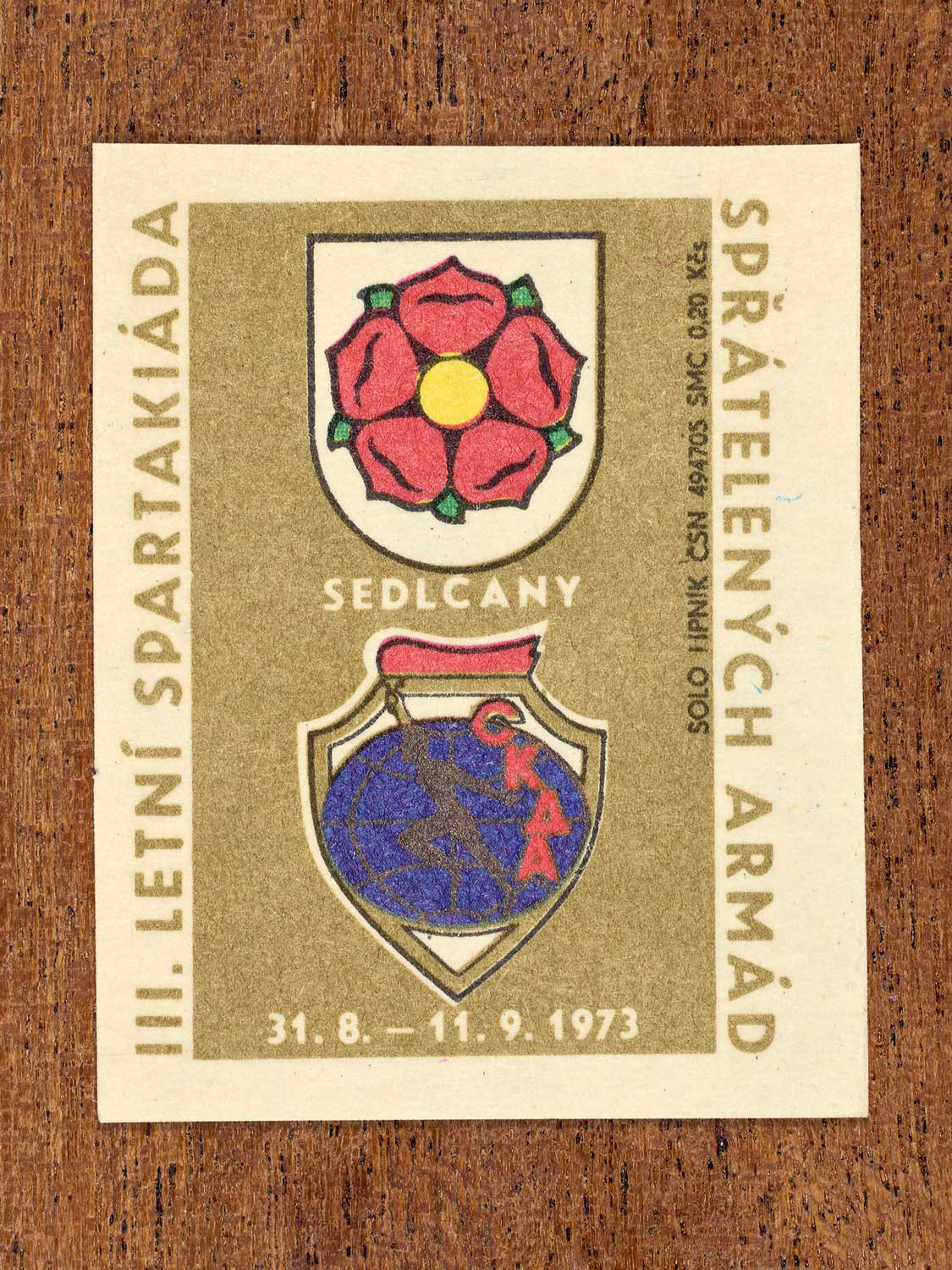 The following labels feature a Czechoslovak military-sports emblem paired with the official coat of arms of each host city.